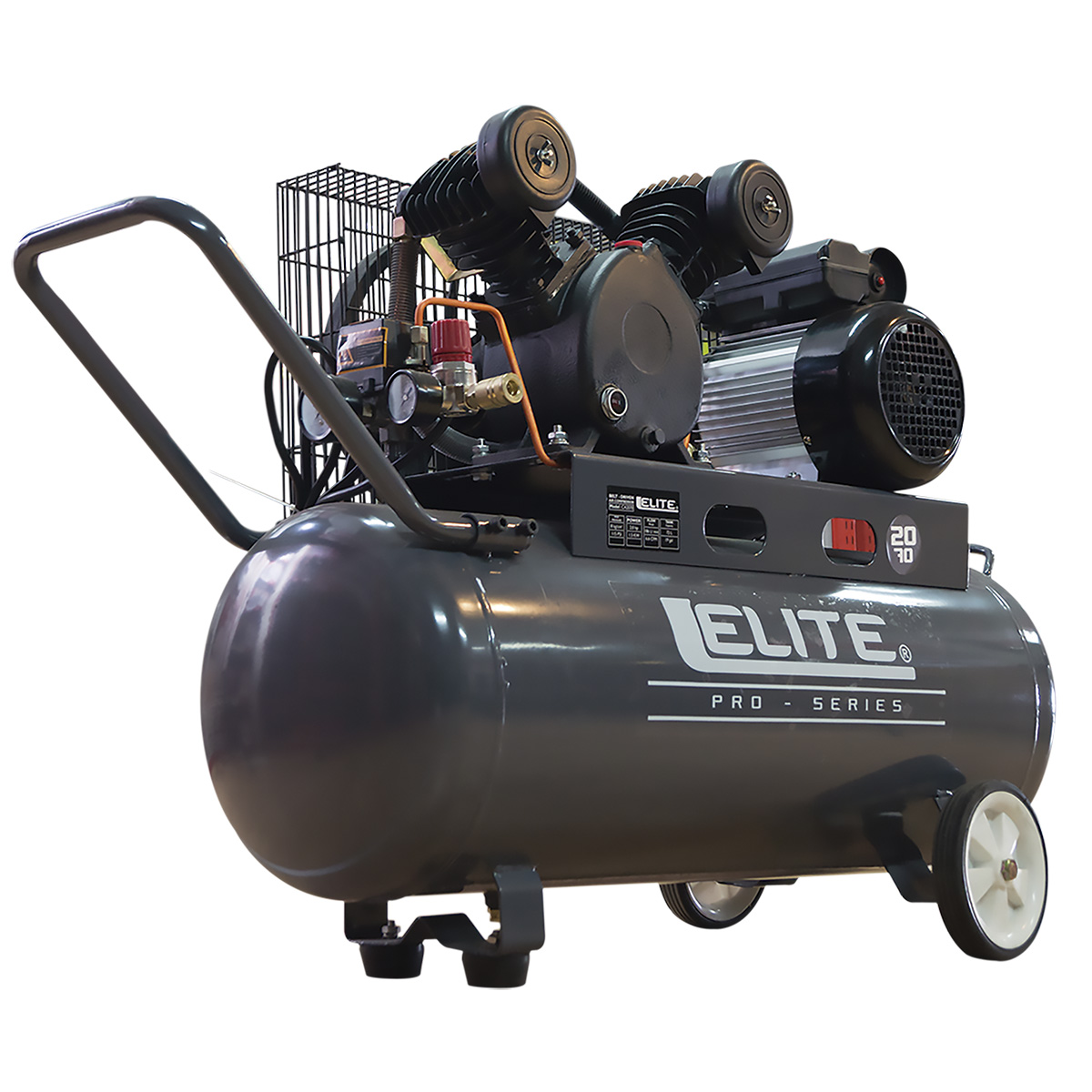 El compresor de aire de polea marca Élite para uso semiprofesional cuenta con una potencia de 1.5 caballos de fuerza, capacidad de 70 litros y presión máxima de 125 PSI.