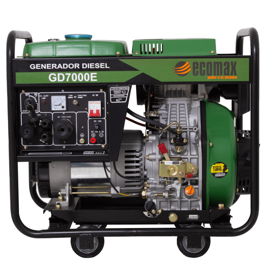 Generador a Diésel Ecomax 7kVA GD7000E| Los generadores ECOMAX Diésel brindan alto rendimiento, gracias al uso de un combustible de mayor poder; Además cuenta con repuestos económicos de alta calidad. Estos generadores atienden las necesidades de generación de energía con eficiencia y confiabilidad y gracias a su sistema AVR (regulación electrónica de voltaje), aportan un excelente desempeño con cargas variables; su tablero incluye breaker de protección, salidas de doble voltaje con selector en las versiones monofásicas y tomas y enchufes machos entre sus accesorios; en potencias superiores a 6.5kVA cuentan con KIT de ruedas que permiten un fácil desplazamiento.