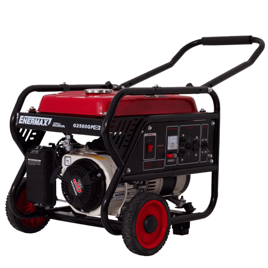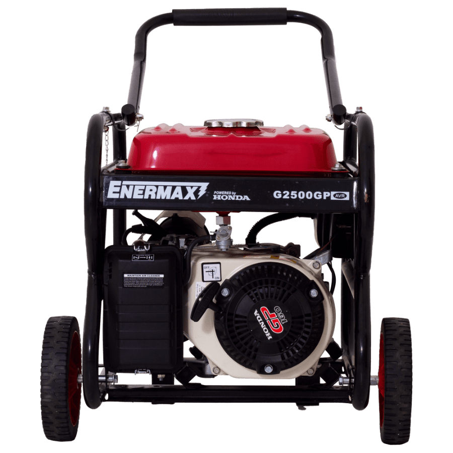 Generador a Gasolina 2.5kVa Enermax G2500GP| Los generadores gasolina ENERMAX, ensamblados con motor HONDA además de tener el respaldo de la marca líder mundial en productos de potencia, permiten atender las necesidades de generación de energía con altos estándares de eficiencia y confiabilidad y gracias a su sistema AVR (regulación electrónica de voltaje), aportan un excelente desempeño con cargas variables; su tablero incluye breaker de protección, salidas de doble voltaje con selector en las versiones monofásicas y tomas y enchufes machos entre sus accesorios; cuentan con KIT de ruedas que permiten un fácil desplazamiento.